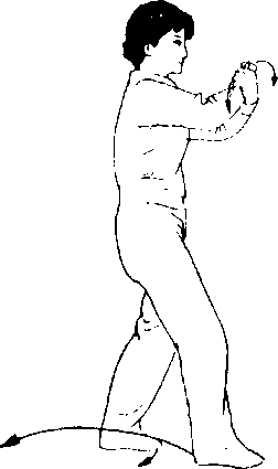 (1) 两掌在胸前仍以两腕 相贴的交叉点为轴,由掌变拳 外旋,向外、向下、向里翻转,左 拳在外,右拳在里,拳心皆朝 里。目视两拳方向。