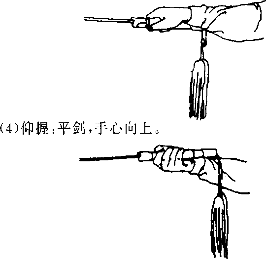 虎口贴近护手,拇指与其余四指相对握拢剑柄。握 剑形式主要有以下四种:(1) 正握:立剑(刃朝上下),小指侧在下。(2) 反握:立剑,小指侧在上。(3)俯握:平剑(刃朝左右),手心向下。握剑时应注意:①手腕要松,手指要活,手心要空。②握剑以 拇指、中指、无名指为主,食指、小指配合,随动作变化灵活掌握, 时握时放,顺其自然。