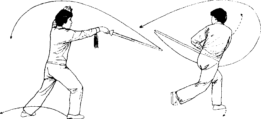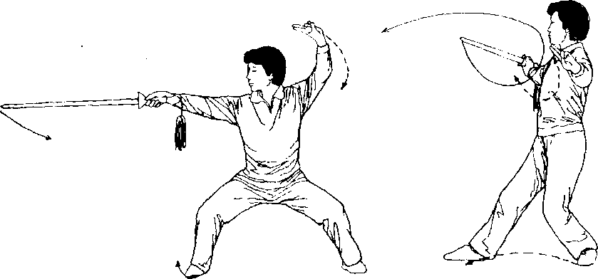 (1) 身体重心全部移至左 腿并屈膝,右脚抬起向左脚后 插步,前脚掌着地,右腿屈膝, 上体左转。同时右臂屈肘外旋, 使右手剑向上向左划弧于身体 左侧,剑柄至左胯旁,手心朝 里,剑尖朝左;左剑指附于右前 臂上,手心朝下。目视剑尖方 向。【要点】转身劈剑运转过程 中,剑的路线必须是一立圆;要 以身带剑,动作要圆活协调。24.白猿献果(并步云托剑)