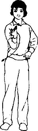 上体微右转(胸朝南),右 小臂内旋回收,右掌收于右腰 侧,掌心向下,拇指侧轻贴右腰 部,掌指尖朝前。目随手视,但 勿低头。