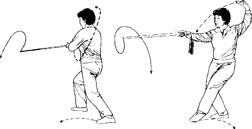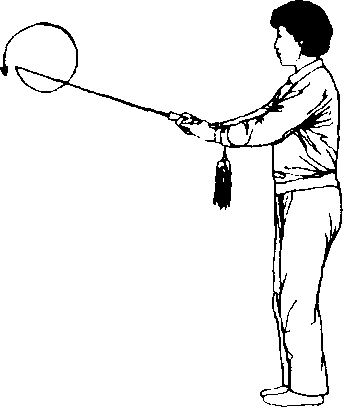 两腿伸起,右脚尖外摆,身 体右转,重心全部移至右腿,左 脚向右并拢成并步自然站立。 同时右手松握剑,以腕关节为 轴,使右手剑内旋,向左向后向 上经头前上方再外旋向右向前 划弧,云剑平托于体前,同胸 高,手心朝上,剑身平直,剑尖 朝前;左剑指向后向左向下向 右划弧外旋,手心翻向上附于 右腕下。目视剑尖方向。