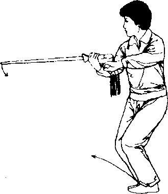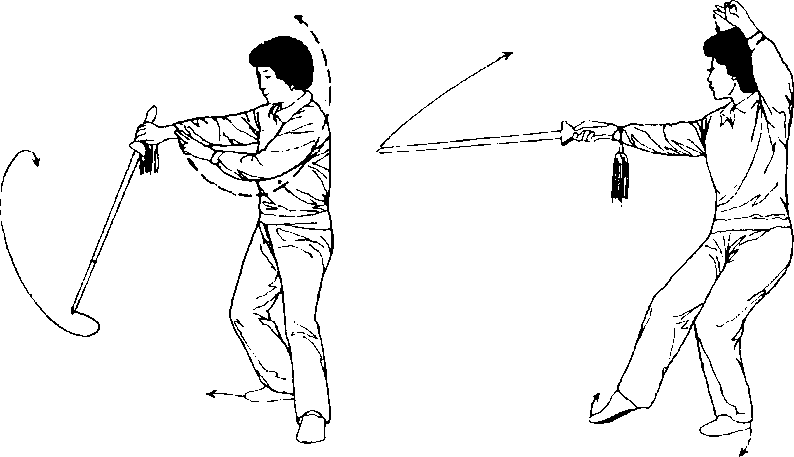 【要点】 上体左右微转,带动右手剑在体前做圆弧运动,幅度不 要过大,动作要柔活。左(右)脚上成虚步与劈剑要同是一致。
