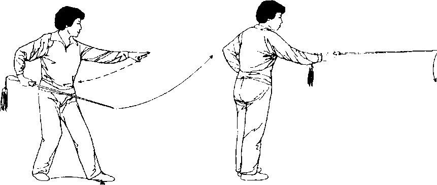 上体微左转,左剑指向下 向左前向上划弧指出,手心朝 下;随之右脚向左脚并拢,上体 再左转,身体自然直立。同时右 前臂内旋再外旋向前伸臂,使 右手剑向上向右向下向左划 弧,向前刺出,剑柄同胸高,手 心朝上,剑尖朝右前(西);左剑 指再收于左腰侧,手心朝上。目 视剑尖方向。