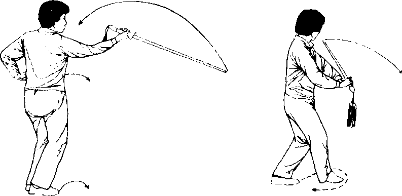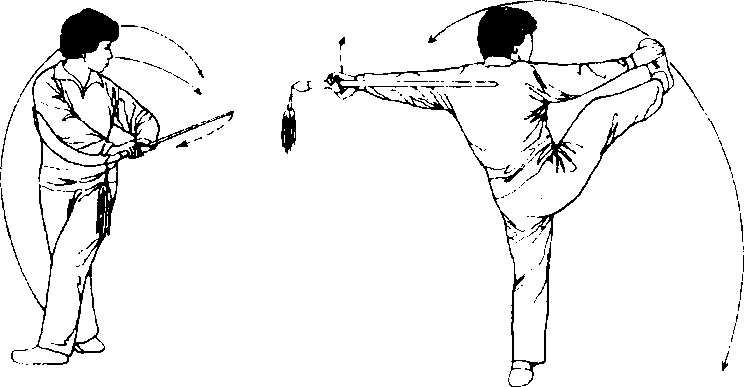 (1)两腿微屈,重心移向左 腿,上体微左转;同时右臂屈肘 外旋,右手松握剑柄,使剑尖微 下垂,接着右脚向右上步外摆, 上体右转。同时右前臂内旋,手 心翻向下,使剑向上向左向下 划弧横于身体左前方,同腰高, 剑尖朝左;左剑指附于右前臂 上,手心朝下。目视剑尖。