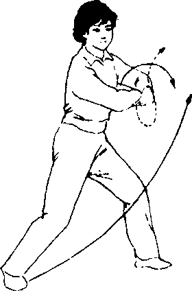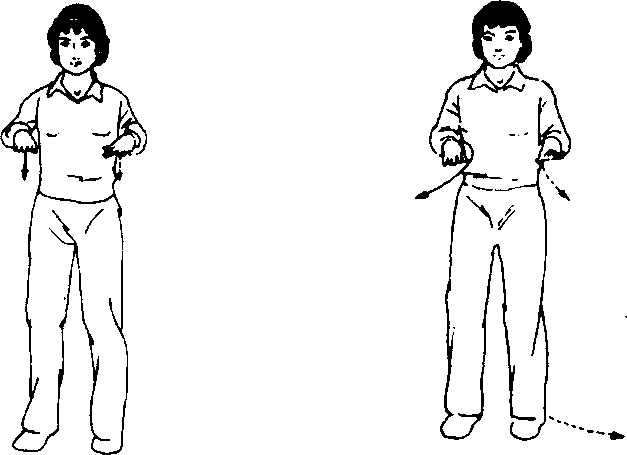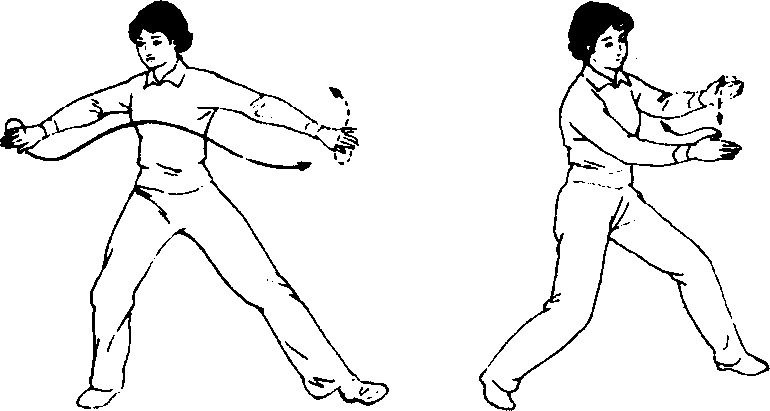 (1)两壁慢慢提起至同胸高、 两腿屈膝微蹲,两手缓缓 同肩宽,掌心朝下,指尖向前。下按落至腹前,掌心朝下,指尖 这时缓缓吸气。 向前。目视前方,这时吸气。两腿微屈,重心移至右腿, 左脚左擦出一步。同时两掌向 下向后向上分别在左右划弧至 同胸高。目视右掌,这时吸气。上体左转,重心移向左腿 成左弓步。同时左掌外旋,掌心 朝右,指尖向前上方。右掌外旋 向左向下划弧合至左掌下约 20厘米处,掌心朝左后,指尖 向左前。目视左掌,这时呼气。