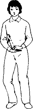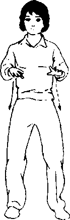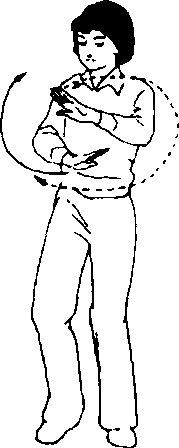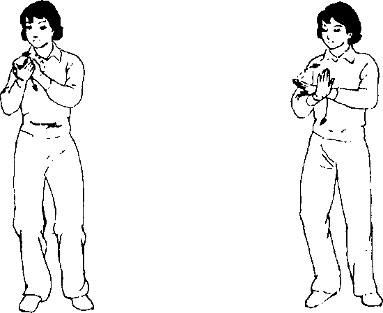 上体向右向左回转。同时 随之左拳变掌,两掌内旋, 右掌托左掌向右向上向左划弧两掌心翻向外,左掌指向上,右 至右胸前。 掌指向左。目视两掌,这时呼
