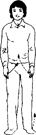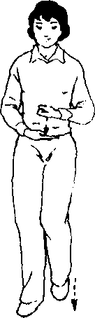 左脚落地下震,两腿微屈 (重心仍偏右腿)。同时左拳背 落砸右掌心。目视前下方,这时 呼气。