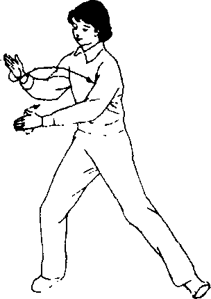 重心移至右腿,左脚抬起 向左侧擦出一步成右横弓步。 同时右手向右向上向左外旋划 弧至胸前,掌心向左,指尖朝前 上。左手向上经胸前向左向下 向右外旋划弧合于右手下20 厘米处,掌心朝右,指尖向前。 目视右掌,这时呼气。