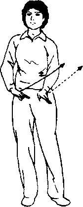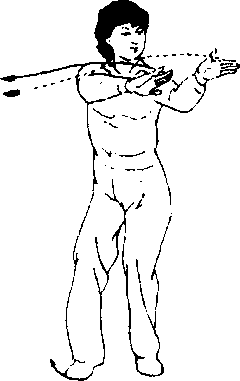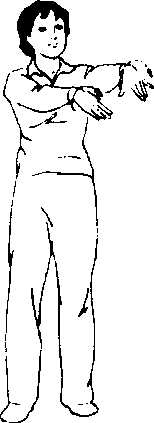 (1) 同时两臂向左、向前划弧, 两腕背侧微凸,掌心朝内,手指 自然下垂,两手离身体约20厘 米。目视左前方。