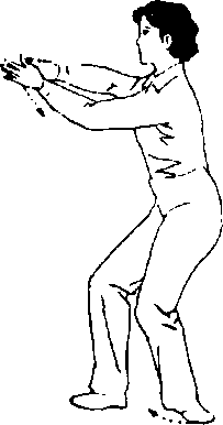 (4) ±动不停,两腿屈膝微 蹲,重心偏于左腿,上体微右 转;同时左臂外旋、右臂内旋, 两臂微屈,肘自然下垂,两手成 横掌,掌心朝外,指尖朝左前 方。目视左掌方向。