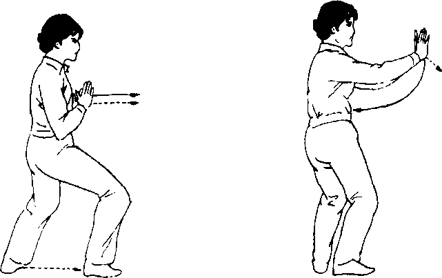 (6) 上动不停,上体微右转 (胸朝东),身体重心移至右腿, 左脚前脚掌擦地前跟至右脚后 侧,全脚虚着地面。同时两掌向 前推出成立掌,掌心斜相对,同 胸高。目视前方。