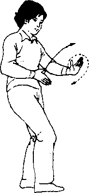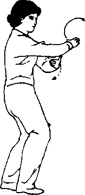 (5) 上动不停,两腿屈膝, 身体重心下降,右脚向右前方 进半步,重心偏于左腿。同时两 臂屈肘内旋,两掌收于胸前,掌 心斜相对,小指侧朝前下方。目 视前方。
