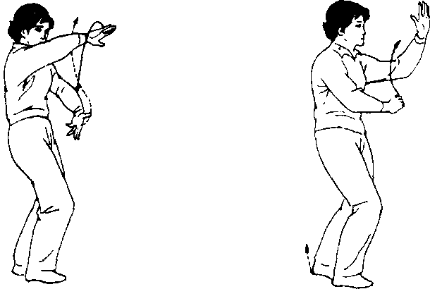 【要点】①倒卷肱是连续开合动作,是在连续后退中完成的。② 在向左或向右转身带动两臂左右展开时,当即将完成两臂伸展 的极短距离内,要加速展臂,趁其反弹之劲迅速转腰合胯,然后 两臂内旋回收,徐徐屈臂相合,突出本动作收展开合、快慢相间 的特点。③倒卷肱的步法是两脚连续后撤动作,是以“转换步”来 连接的。