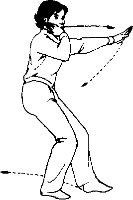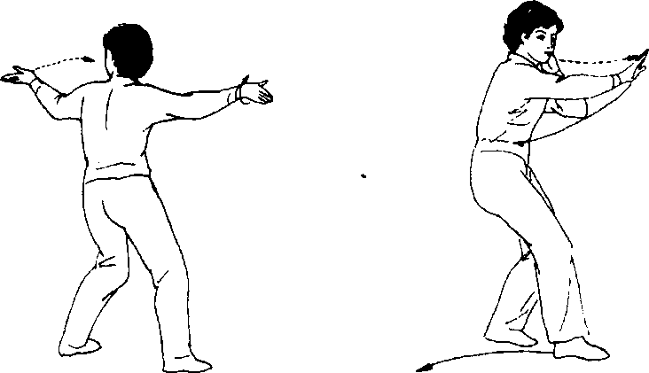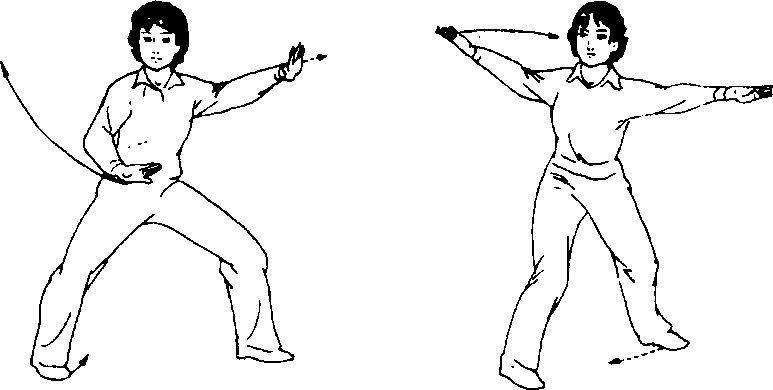 (3) 上动不停,上体左转, 右胯外展,身体重心移向左腿。 同时右掌外旋向右展臂,掌同 肩高,掌心朝前,指尖朝右。左 掌向左、向上划弧外旋展臂,掌 同肩高,掌心朝前上方,指尖朝 左。目视左掌。