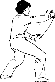 (5) ±动不停,右脚尖经左 脚内侧向右后方弧形擦地撤成 左偏马步,随之上体右转(胸朝 东南)。同时右掌向下、向后划 弧于腹前,掌心朝下,指尖朝左 前方。左掌内旋向下、向前经右 前臂上方向左、向上划弧至左 前方,掌同肩高,掌心朝外,指 尖朝右前上方。目视右掌。