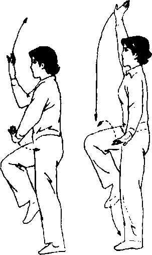 (9) 上动不停,重心全部移 至左腿,左腿伸起,右腿屈膝提 起,膝同腹高,脚尖自然下垂。 同时左掌向左、向前经左前臂 内侧向上穿出,经面前时,右前 臂内旋向右上方展臂,掌心朝 右,指尖朝上。左掌向下、向左 按于左胯旁,掌心朝下,指尖朝(10) 上动不停,左腿屈膝 下蹲,右腿屈膝下落,右脚在左 脚内侧轻轻踏地,两脚相距约 10厘米。同时右掌随右脚下踏 按至右胯前,左掌稍抬起与右 掌同时向前下按,两掌心都朝 下,指尖朝前。目视前下方。前。目视前方。