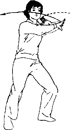 腿,屈膝微蹲,右脚收至左脚内 侧,脚尖虚点地面,上体微左转 (胸朝东南)。同时左掌外旋,成 立掌,掌心朝右前方。右掌继续 向左划弧于胸前,掌心朝左,指 尖朝前。目视左掌。