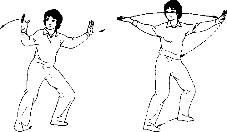 (4) ±动不停,重心移向右 腿成右偏马步。同时两掌分别 向上经左右向下划弧下落,左 掌于身体左前方成立掌,指尖 稍高于肩;右掌于身体右前方 成立掌,指尖稍高于肩。目视右 掌。“高探马”定式(5) 上动不停,右脚尖内 扣,合胯,上体微右转。同时左 臂稍内旋,右臂外旋分别向左 右平展,掌同肩高,左掌心朝 下,右掌心朝上,指尖朝右。目 视右掌方向。