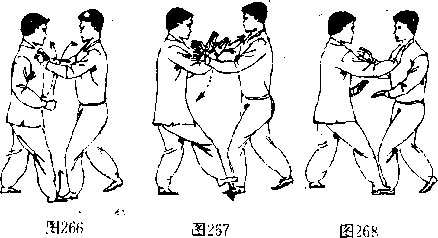 甲方站立.乙方上步进身出双手抓拿甲方胸口。(图 266)甲方身体后坐以避,并出双手从乙双手间向上穿过、向 左右两侧分拨乙双手,随即右脚稍上提后,又向前下方震脚踩 压乙方前脚照I背;同时左手向内、向下收靠,右手立掌向前推 按乙方胸部,手、脚同时用劲,上下制击乙方。(图267,268)