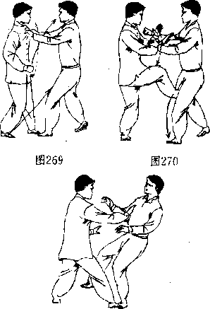 乙方双手抓拿甲方胸口。(图269)甲方双手向上穿过 乙双手,向左右两侧分援;同时右脚脚尖上勾,向前上方勾踢 乙方裆部。(图270)