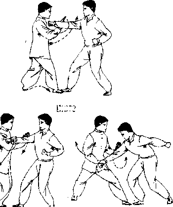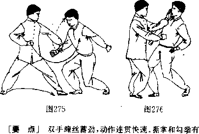 【第37技】乙方上步出右直拳击向甲方。(图272)甲先出左手拦 截,并左脚跟步进身,右手反手抓拿乙手腕向右下“捋”而拽 带,出左手向上、向右“洌”劲击乙手副随右脚退步而身体下 沉,并粘制乙手-向下沉劲。〈图273.274)图272图272图273图273图274图274图272图272图273图273图274图274随即甲方左手粘乙右手向左搂化,右手略收握拳,右脚跟 步进身,身体左转,左手向上、向右挥掌捆击乙方右耳部;右拳 向前勾击乙腹.(图275.276)合劲。