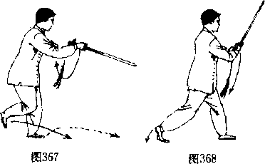 接上势,身体重心前移,右脚稍提起后向前迈一步,左脚 在右脚踏实后,亦向前跳一步,右脚落步后成左虚步,身体重 心后坐。同时右手持剑柄在腹前划弧内收。右手心向上,虎口 斜向前下,剑身斜对前下方’眼看剑身。(图367、368、369)