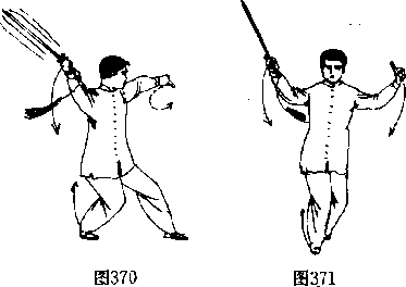 双脚成左虚步不变,重心后坐,身林正直并正对前方。双 手同时向两侧上方分臂捌开,左手剑指展于左上方,手心向 外,手指向前下。右手握剑以剑身向右后上方“糊”劲抖弹挑 糊,右手与右耳同高,手心向内、虎口斜向后上方。剑身斜直. 眼看前方。(图370,371)