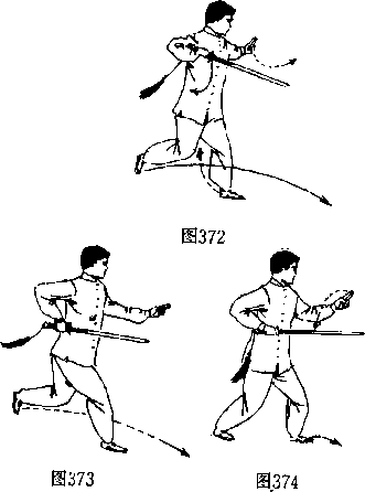 接上势,身体重心前移,右脚精提后向前方迈一步,左步 又跟随向前跳跃一步。双手内收,右手持剑向内收集于右腰 旁,剑尖正对前方。左臂前伸,左手剑指手指向前手心向右。眼 视前方。(图 372,373.374)