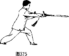 左脚向前出半步,重心前移成左弓步,身体正直下沉,右 手握剑从腰间向前方平刺剑,剑身平直高与胸齐,左手剑指内 收靠于右手肘旁。眼看前方,(图375)