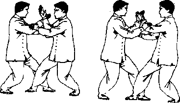 按劲是以掌中心为轴心,用掌的四周旋转压迫寻找对方 空虚处。在推手中,我方以双掌按住对方一手臂向其按击。双 手虚实转换,一手控制腕部,另一手控制肘部,使对方不易还