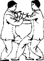椎手双方以弓步站立而对。重心落于两腿之间,便于进攻 时坐实前腿,引化时坐实后腿。同时双方各以右手或左手向前 制出,高不过眉,掌心向外,两肩放松,肘节下坠,以手腕之下 的外侧部相互粘贴拙住,腕节对向自己的胸部中线。掌心向内 时,大指对向鼻尖;掌心向外时.小指对向鼻尖。同时左手或右 手手腕节下尺骨部轻贴于对方肘节之上的臂部。然后双方以 缠丝划弧方式对推,一方主动进攻用按法,另一方则用胡法引 化;一方用糊法攻击,另一方以捋法相化.如此重复进行拙捋 挤按四手法的练习.
