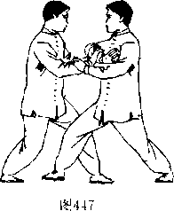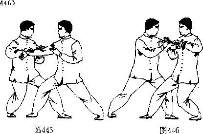 捋劲是湖劲的反面。对方的按击被我搠化后,即变为 “挤”劲继续向我攻击,我划瓠捋回,引其近身向左、右两侧化 之,使其劲落空。(图445)