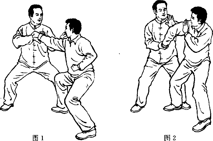 应。搠劲是一种螺旋式的弹性劲,它运行的特征是下塌外碾,松活 而有韧性。双方搭手则细听来力,边听边进,边化边发。如果来力 比我力小,我即撼劲加强,将它撼出,或顺势拿之(我右手反拿敌右 手,左手管住其肘,合击之)。如来力甚猛,则走动作二,用握法。这 叫随屈就伸,急缓相应。(图1、2)