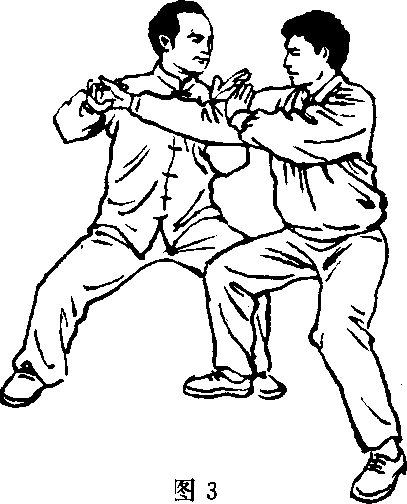 敌来力凶猛,且进身较近,我即迅速将拥劲变为搬劲,向我身 右侧偏后搬出。此称掘化之法。搪式尤其要走下塌外碾之劲。双 掌先塌掌根,左手逆变顺,塌小鱼际变顺;右手顺变逆,塌大鱼际变 逆。在意念中塌掌根要力达对方之脚跟,然后向外碾(即走螺旋式 的下弧线)向右后侧发之。所以拳式中凡顺变逆,逆变顺都要先塌 掌根,再走振劲,有时走双手,有时前手走前臂里侧,走里合肘劲, 后手向右略外拨开来力后弓1(或拿)之。(图3)