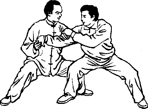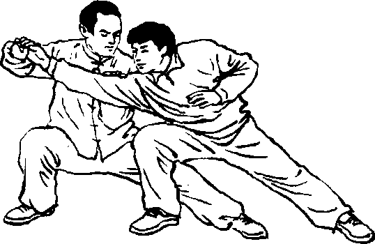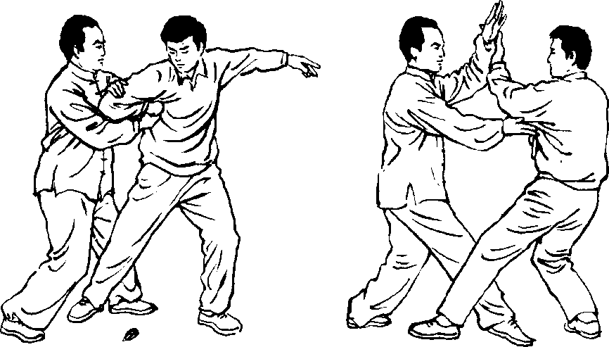 敌欲退,我变进。敌右 膝被蹬,欲退步变招,我即 乘势双手由握变按,同时, 我若系插裆,则可以迅速 走肩靠,肘击(击胸、击肋、