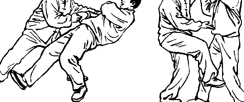 皆宜。如我是左腿套在敌右腿外侧扣住,即可运用摔法。如敌人退 得快,我可用跃步快速进攻。此动作特别要注意腰劲的运用。“进 要腰攻(图6、7)