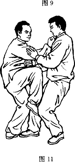 第一段之含义是趁敌人后撤之机,我双手合拿其右臂或左臂。 拿右臂即我右手拿敌右手,左手管住敌右肘,合击之(图9);拿左 臂,则以右手上托其肘关节,左手下采其前臂,上下合击(图10)。 第二段之含义,即左右手走上下分制劲,右拳击其胸部和下颌骨。 同时以右肘点击其胸部。此谓“迎门肘”(图11)。如走敌左臂外侧, 则以右拳、右肘击其空肋。下部则提膝击其裆部、腹部(图12)。第 三段含义,即双手上下合击其左臂,右肘下采其反关节。此谓“横采 肘”。下盘则用右脚踩跺敌脚。震脚更重要的含义是加大双手合击
