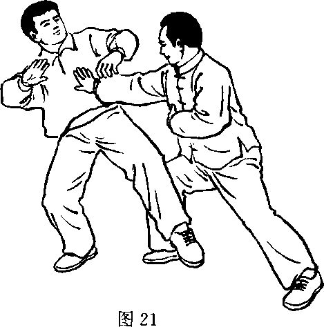 空。引进时,我还可以以右手反拿敌右腕,使之上身前倾,在引进 时,可以同时进右肩发靠劲,此谓“边引边靠”,“左引右靠”之法。 (图 22.23)
