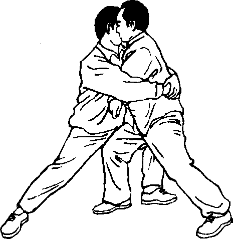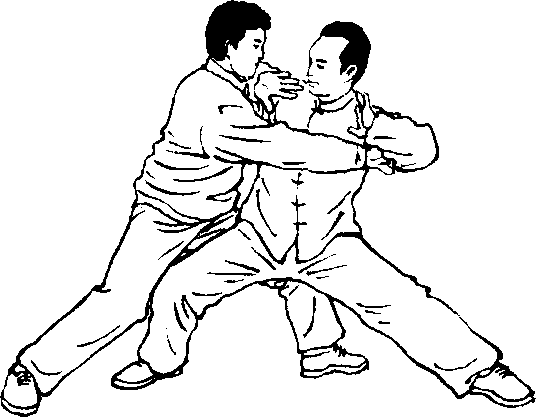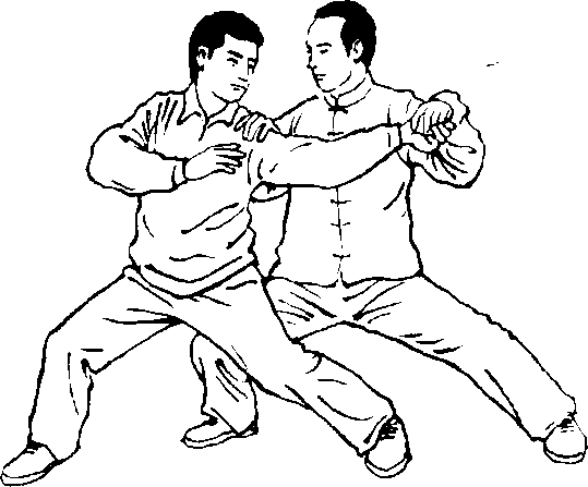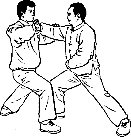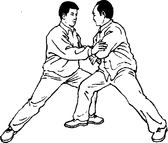 动作五: 接上动作,在掘敌使其不得势时,敌变招抓我双肘弯,上左步