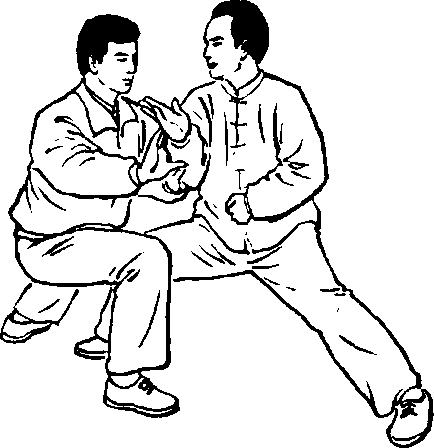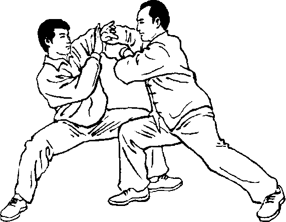 敌人从我右侧,双手抓我右臂施推按之劲,欲将我按瘪推出或 推倒。我即乘势右臂下沉划弧随身左转,向左前下引进,使来力落