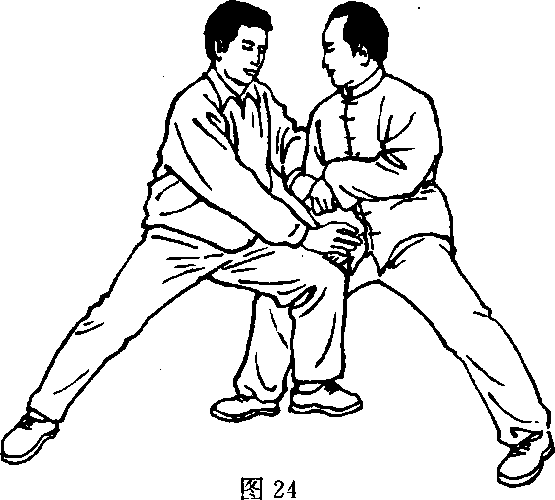 我双手逆缠下沉(向左前侧下沉,此沉是为了欲上先下,欲右先 左),双腕合住劲,准备用双肘、双手反击敌人。如上动作我用右手 反拿敌人右腕下沉之后,我左手可以配合右手拿住敌人手腕准备 边拿边发之。(图24)