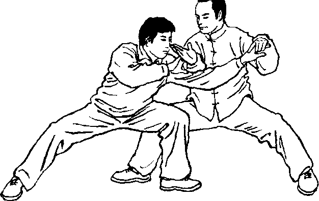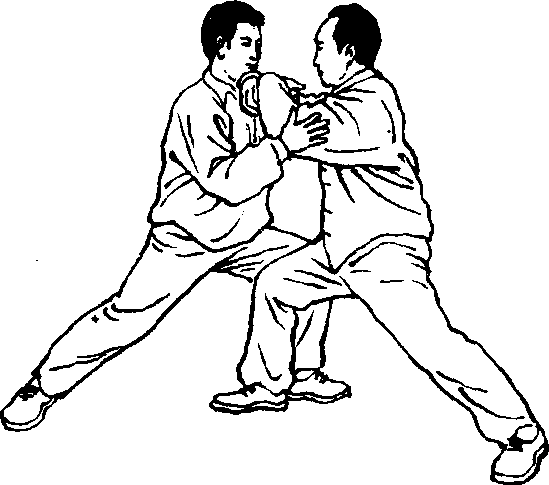 接上动作,当敌人落空之际,我迅速双臂合力向前上挤击敌之 胸部、头部;如此时敌双手投我双肘,正好我可收肘借力发放双手 双腕击打对方之掘挤劲。若按上动作敌按推劲落空、身体前倾之