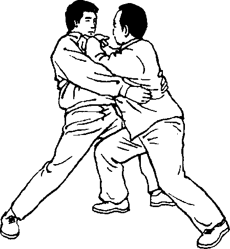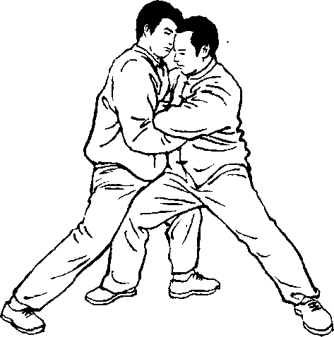 若敌此时从对面双手将我拦腰抱住,欲将我摔倒在地,我即松 肩坠肘,含胸塌腰,屈膝向左下松沉,然后用双手臂合力反击敌之 胸部、咽喉部,这样既可以解脱敌环抱之围困,又可以将敌发倒。但 此时一定要注意双手肘向右上发劲,左臀必须下沉,以体现右发左 塌之势,保持重心稳定。(图27、28)