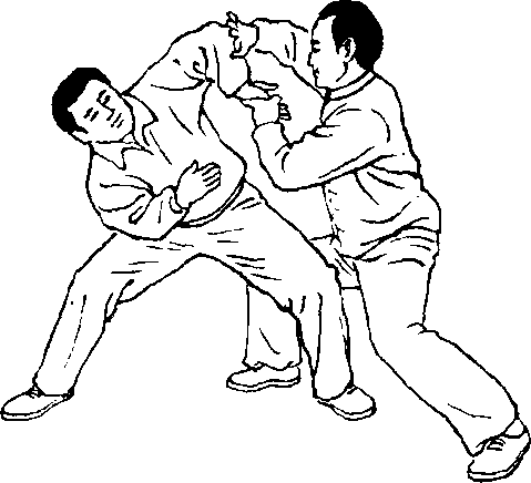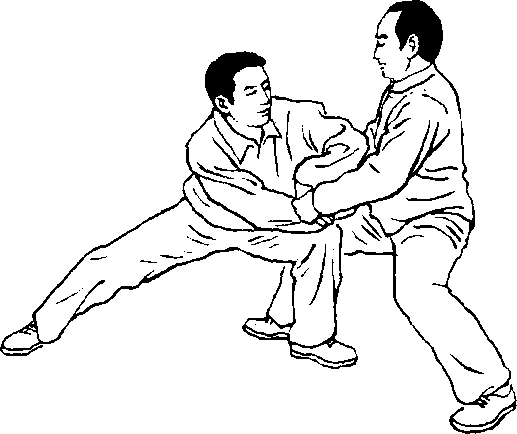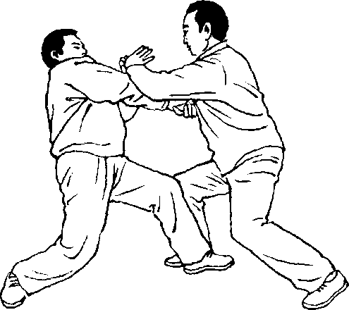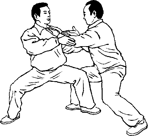 设对方在我右前方 双手用按劲按我双肘及 腕部,或用双手抓住我 双腕部用按劲向前上 步,欲将我推出跌倒。我 即乘势身先向右转,重 心偏左后,左腿逆缠里 转;右腿顺缠外转,膝里 扣合住裆。同时双手顺 缠旋转外翻,右臂手里 合引化对方左手的按 劲,使其劲偏于隅角。同