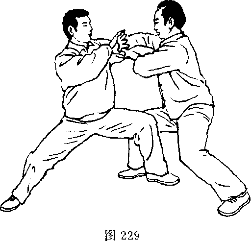 时左手由右手下乘机向对方腹部或胸部击去;对方如含胸塌腰后 坐,化我左手进攻之劲,我即乘势身向左转下沉,重心向右前移,我 左手略逆缠下沉收回,右手逆缠里转向前击对方的胸部。距离近用 肘击,距离远则用手击。(图228、229)