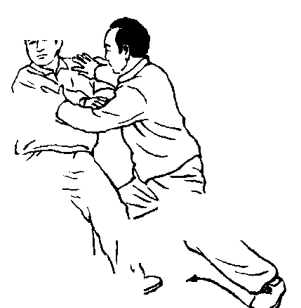 我左手同时由左上变顺缠向下沉向敌身右肋及后腰撞击。或我双 手向右后搠击其双臂,使其后仰。(图233)