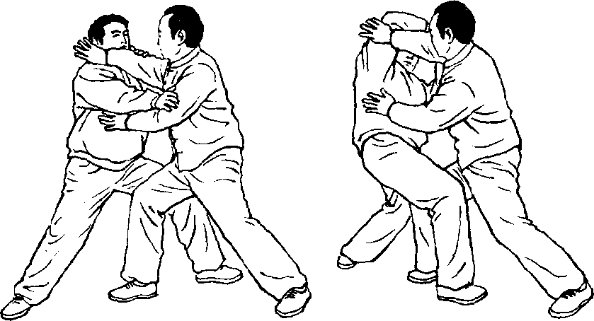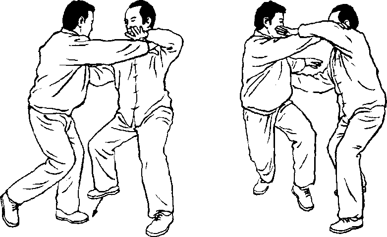 设接上动作,我右前对手刚被我击中倒地。这时另一对手从我 身左后进右步用双掌施按劲向我身左侧肋部击来。我即乘势身右 转略下沉,重心在右,眼看身左侧。同时左腿逆缠提起用脚踵向对 方右腿膝部或迎面骨蹬踩,或进步插入对方裆内,或套住对方右 脚,准备贴近对方之身进击,同时我左臂手顺缠向右前方引进,使