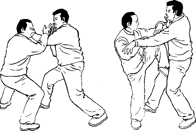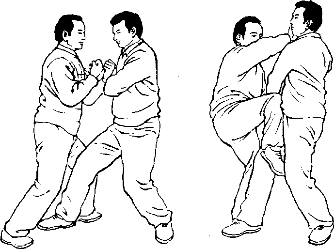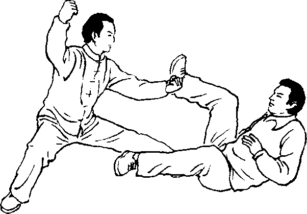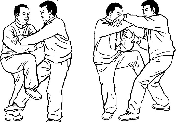 连接上动作,如果 敌进右脚、双手向我左 臂肘推来,迅速凶猛,我 引化稍迟,不慎被其推 动重心受制,有被其推 出跌倒的危险,我即乘 势身略向右转,右膝弯 屈,快速跌下,右臀部及 膝里侧着地。同时我上 提左膝,左脚快速向敌 右腿下部、胫、腓骨蹬 击。这是败中取胜之法。