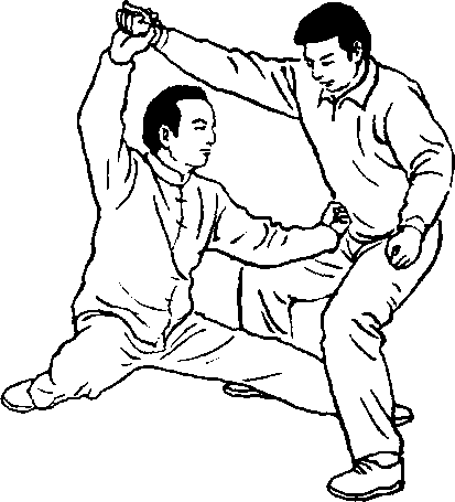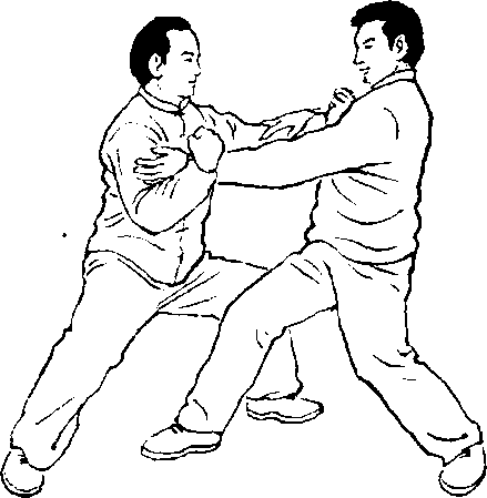 接上动作,敌双手按劲被引进落空失势,不等敌换劲变招,我 乘机身略右转下沉,重心移到右腿,与敌失势落空方向相反,左腿 逆缠变虚并步,同时我双手以右逆左顺缠下沉,由敌双臂下以左手 走下弧接近敌胸部和下须,准备变招击敌。