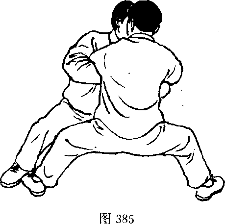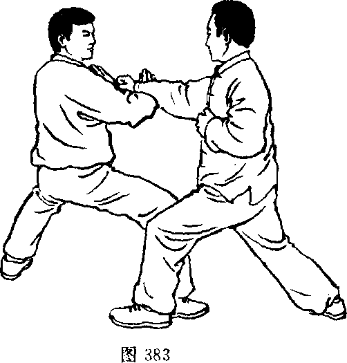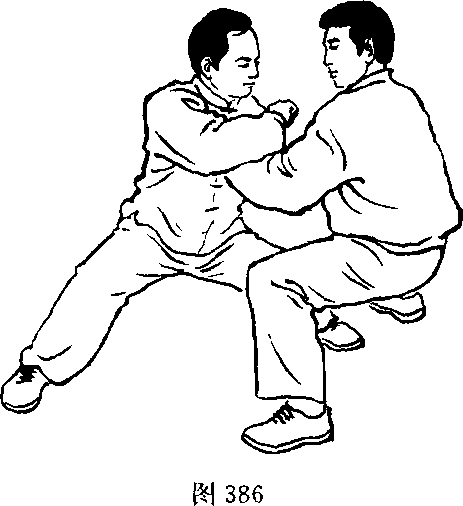 接上动作,敌双臂 腕手被我绞击而处于背 势,如我还不想放过敌 人,我即趁势身微右转, 重心偏右再移左。同时 双拳先下沉施采劲(上 下相合),再向左右分开 敌双臂,使敌胸腹部暴 露而处于背势。(图 387)